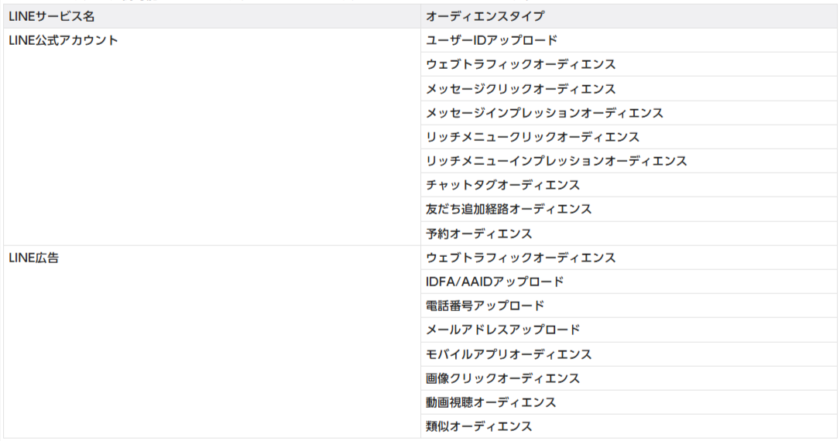ディスプレイ広告に連携できるLINE公式アカウントとLINE広告のオーディエンスタイプは以下です。