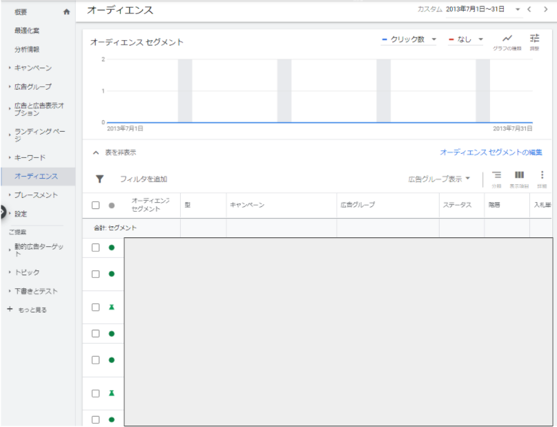 | オーディエンスセグメント | アフィニティ セグメント、購買意向の強いセグメント、類似セグメント、詳しいユーザー属性セグメント、広告主様のデータ セグメント(旧リマーケティング)、カスタムセグメント、ライフイベントセグメント |