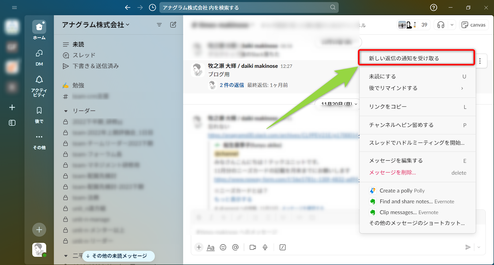 通常、自分がメンションされていないかつ発言していないスレッドの投稿の通知は来ない仕様ですが、「新しい返信の通知を受け取る」機能を使うと特定のスレッドの投稿はメンションや発言を指定無くても通知がくるようになります。