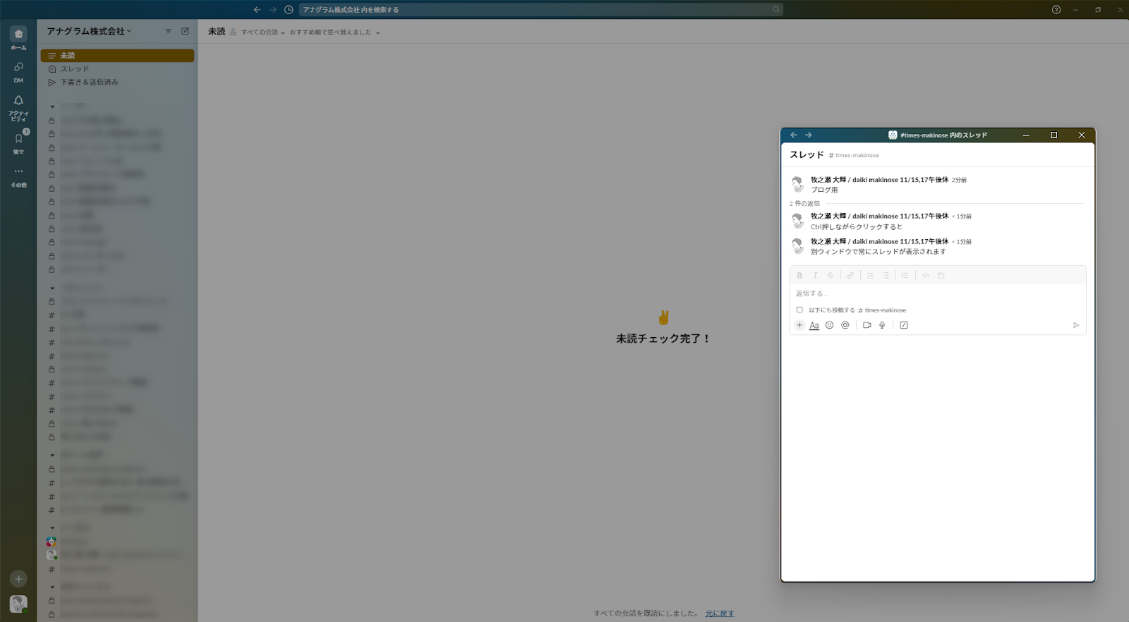 このように全体のチャンネルを見渡しながら、特定のスレッドを常に表示させることができます。