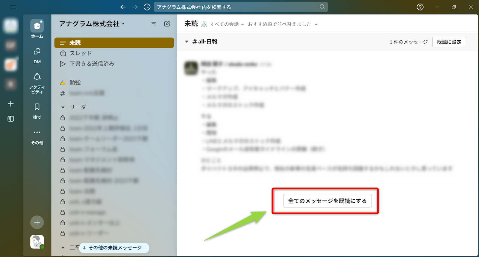しかも新規投稿の通知は各チャンネルに遷移せずとも、一番下にある「全てのメッセージを既読にする」で全て既読にできます。