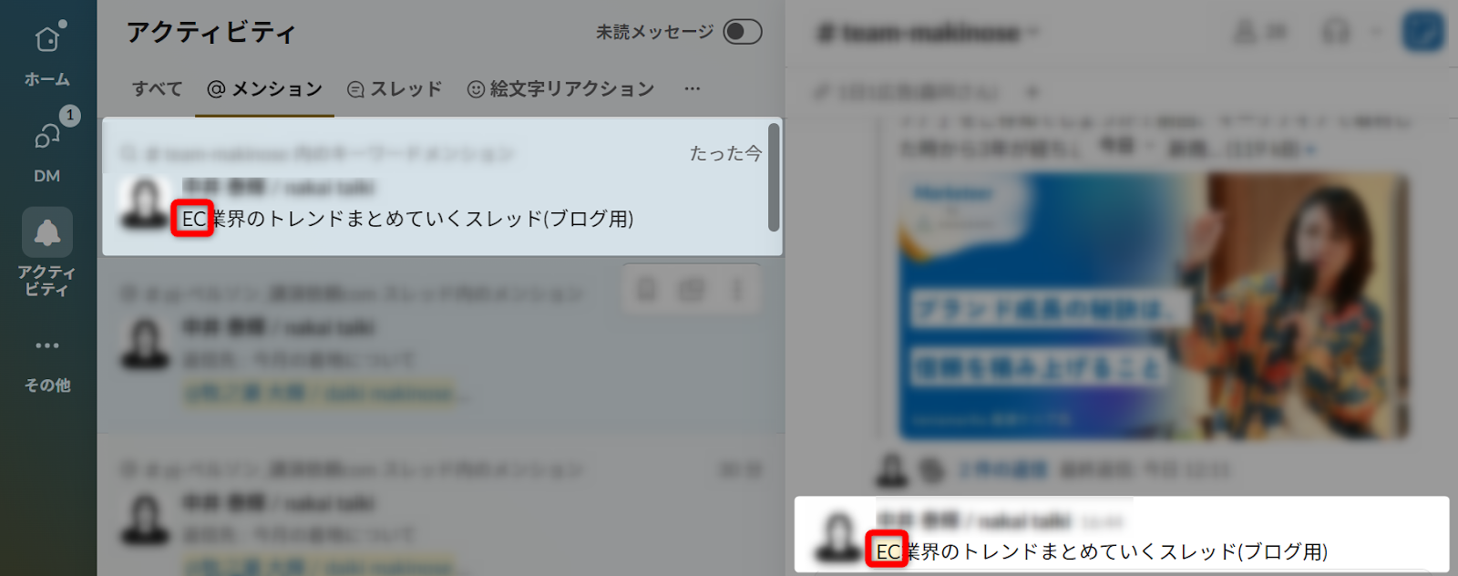 特に重宝しているのは「Alt + クリック:未読にする」の機能です。未読機能を活用すると読み飛ばしてしまったり、メンションされた連絡の内容だけ確認してあとで返信する際に便利な機能です。