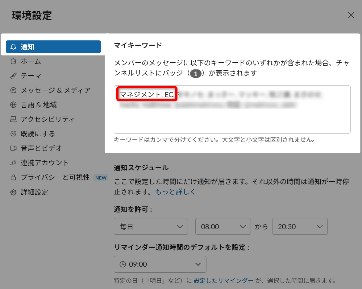 登録方法は、未読の設定と同様に左下の自分のアイコン>環境設定>通知内のマイキーワードの項目に入力すると登録したキーワードを含む新規投稿があった際に通知されます。