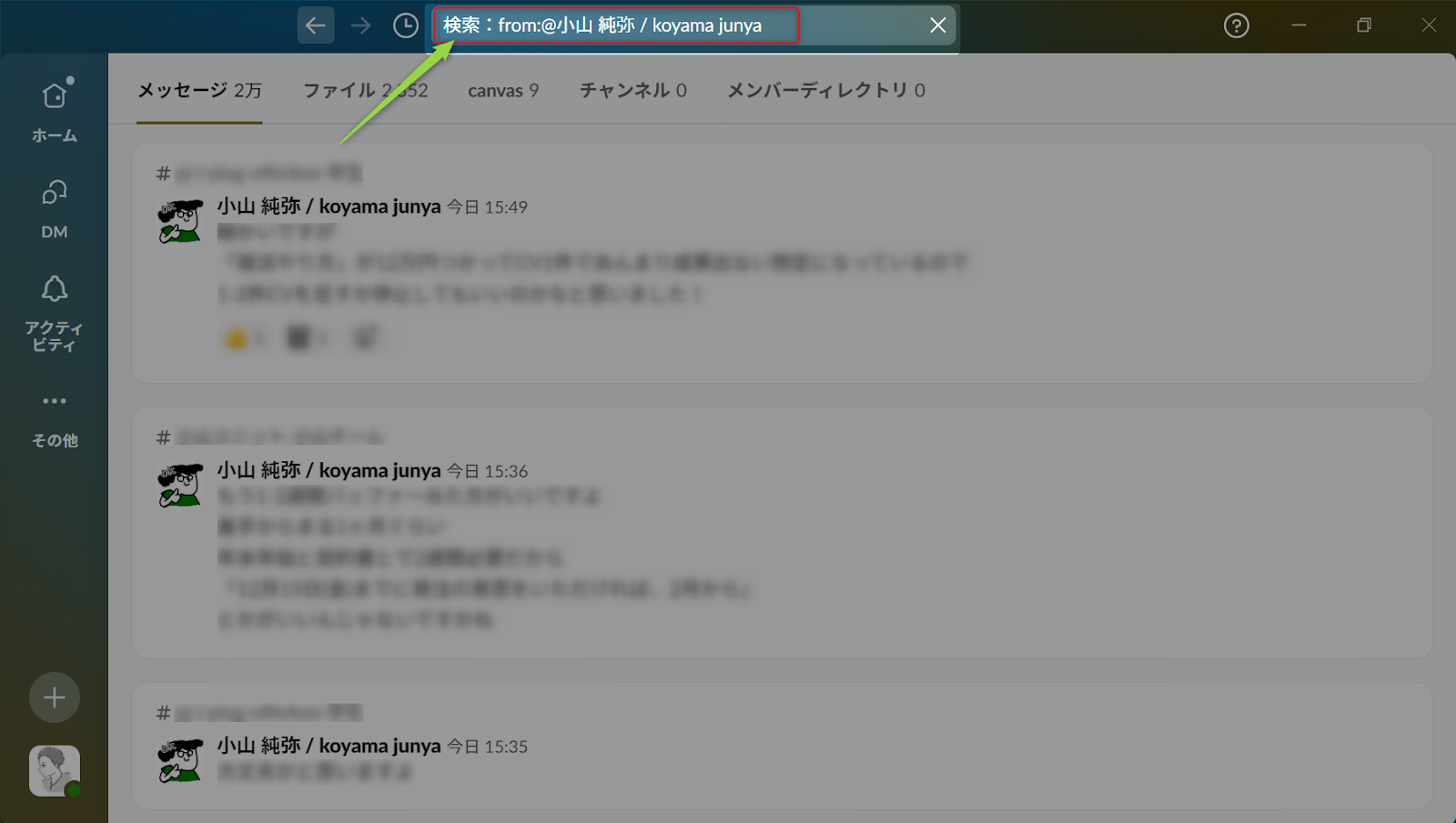 ○○の部分に@から始まるユーザー名を入力し検索すると、特定の方のSlackの投稿のみを検索し確認できます。