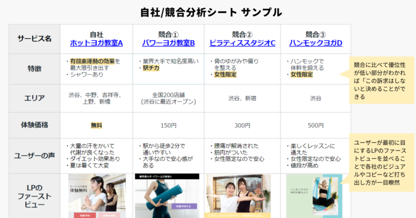 自社/競合分析はこのように1つのシートにまとめることで、強みや弱みが明確になります。