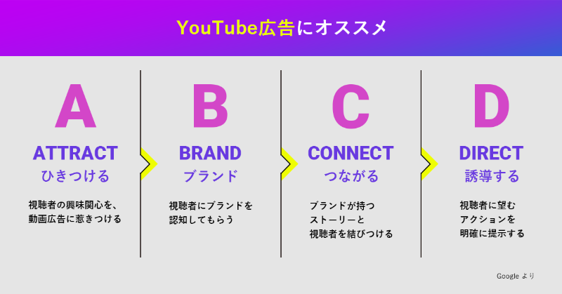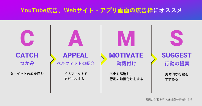 私は、長尺でしっかりと商品の特徴を説明する必要がある場合は、ABCDかCAMSをベースに考えることが多いです。その中で、ブランド認知はABCD、購買へ繋げたい場合はCAMSと使い分けています。