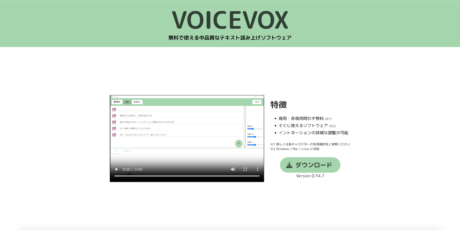 「VOICEVOX」はテキストの読み上げができる、無料の音声合成ソフトです。商用利用が可能で、20種類以上のキャラクターから声質を選べます。