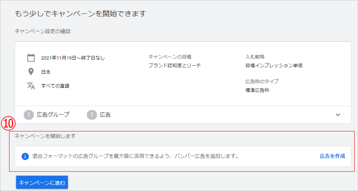⑩ この画面では広告グループにバンパー広告(前画面でバンパー広告を入稿した場合はスキップ可能なインストリーム広告)を作成できます。追加で入稿しない場合は「キャンペーンに進む」を選択し完了です。