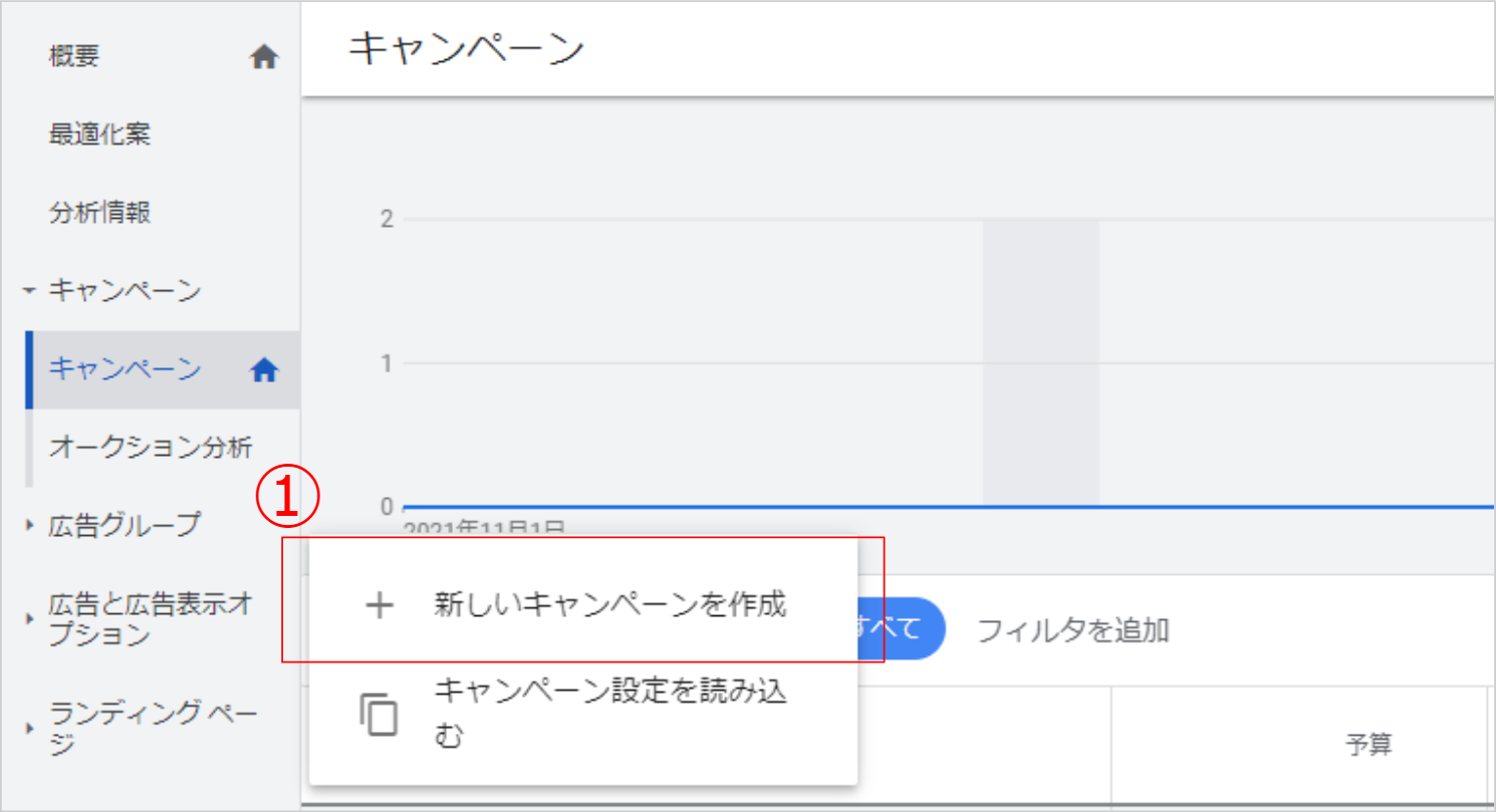 ① 「+」ボタンから新しいキャンペーンを作成を選択します。