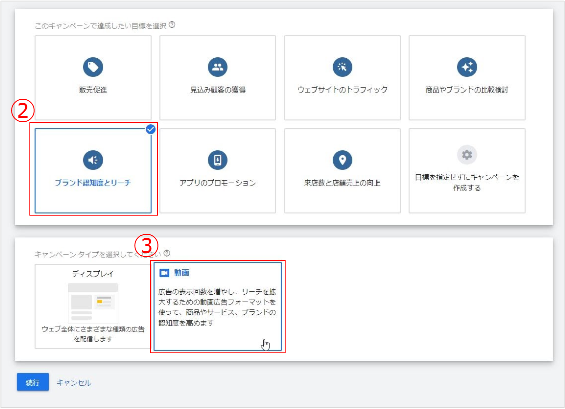 ② キャンペーンの目標は「ブランド認知度とリーチ」を選択し、キャンペーンタイプは「動画」を選択します。