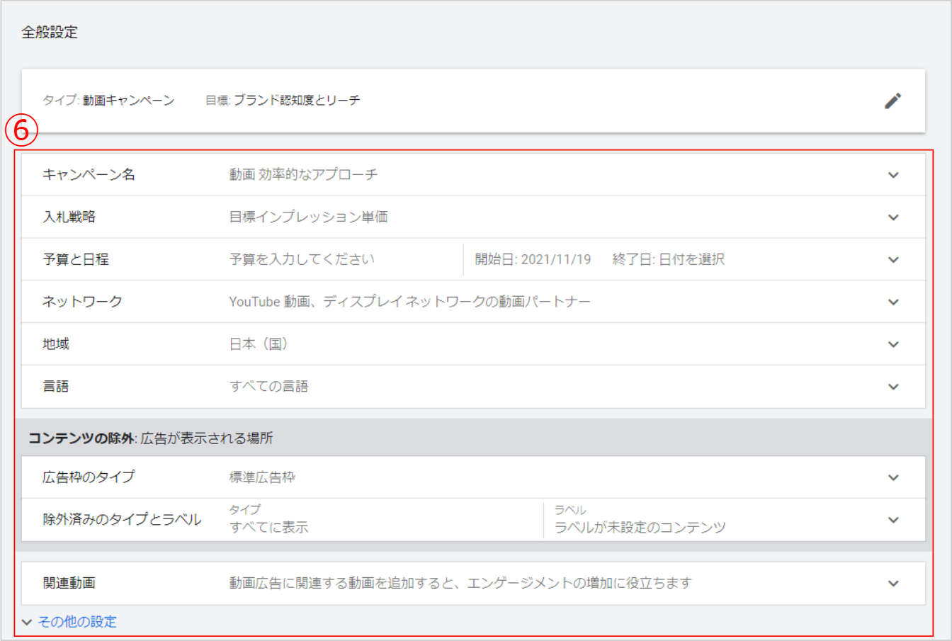 ⑥ キャンペーン設定ではYouTube 広告を設定するときと設定方法は変わらないため、項目を上から順に設定を行っていきましょう。
