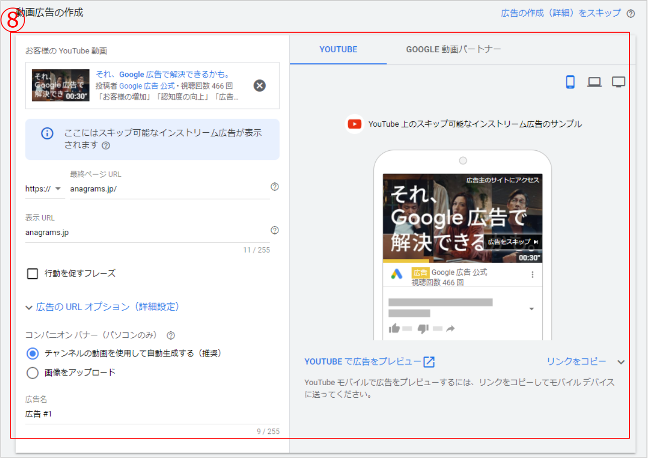 ⑧ 動画広告の作成では公開 or 限定公開されている動画のURLを設定し最終ページURLと表示URLを設定します。必要であれば行動を促すフレーズや広告のURLオプション、コンパニオンバナーの設定も行います。