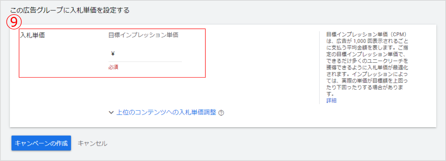 ⑨ 入札単価「目標インプレッション単価」を最後の項目で設定しキャンペーンの作成を選択します。なお、動画リーチ キャンペーンはCPM課金(広告表示回数1,000回あたりに掛かる費用)のみです。