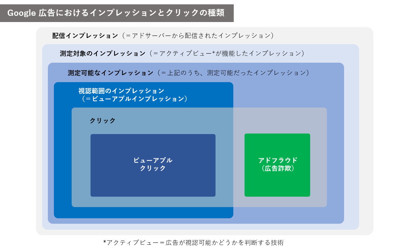- ビューアブルインプレッション=広告掲載インプレッション×ビューアビリティ(%)