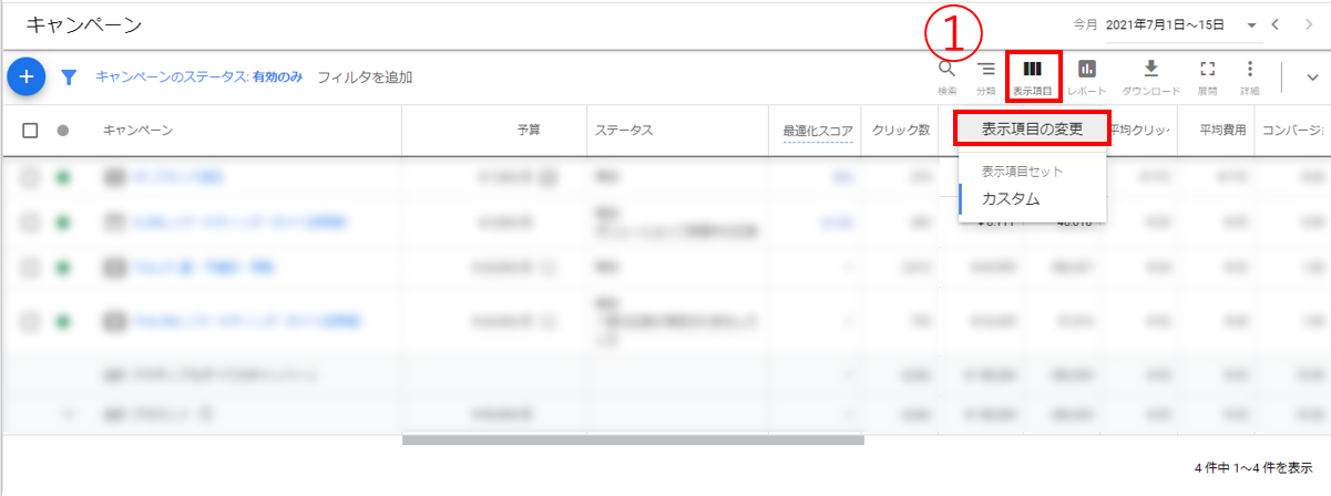 ①管理画面上の[表示項目]から[表示項目の変更]をクリック