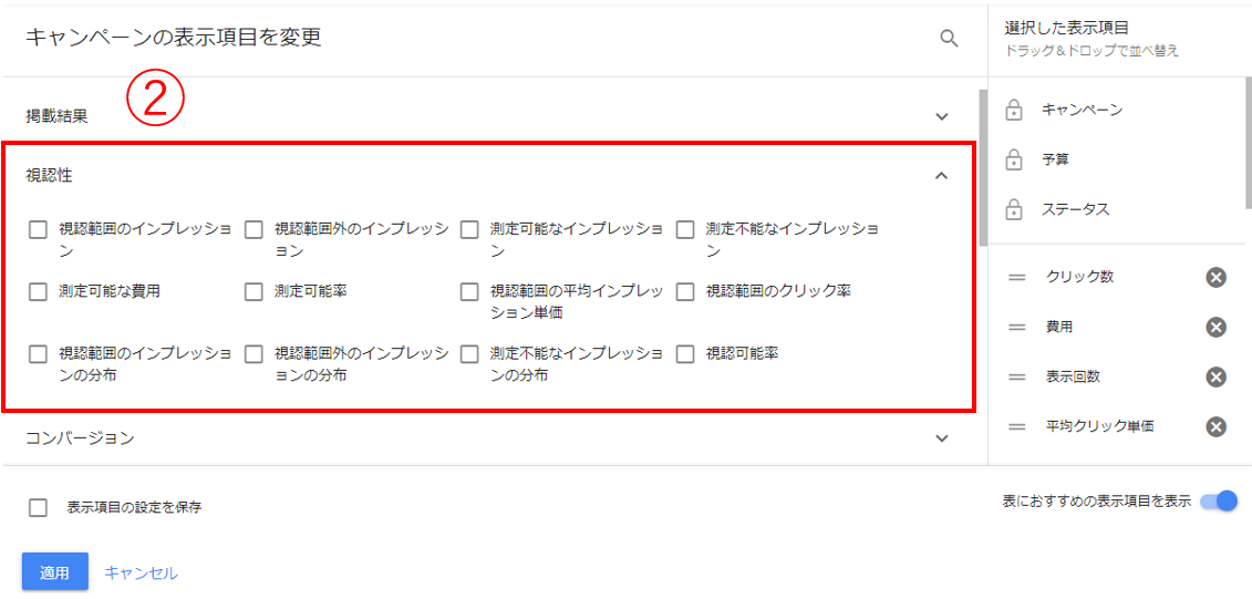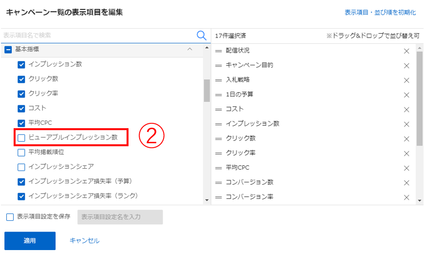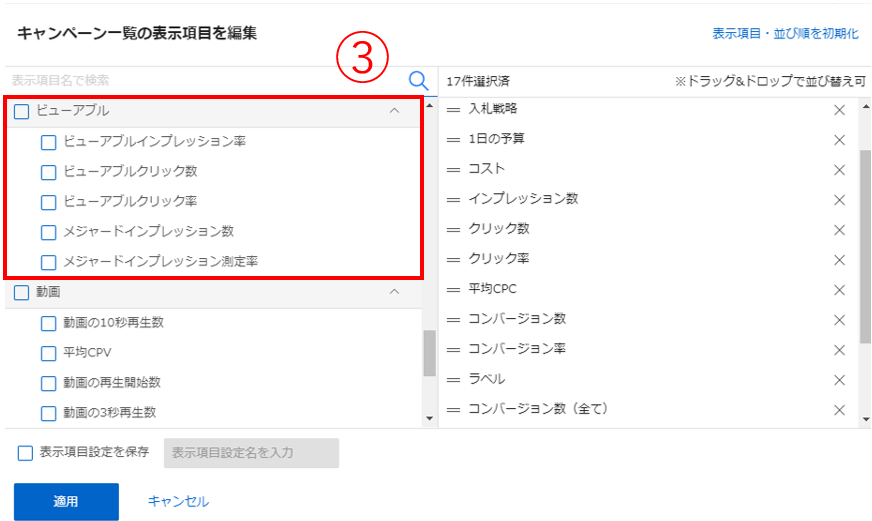 ③[ビューアブル]タブから各種指標にチェックを入れる