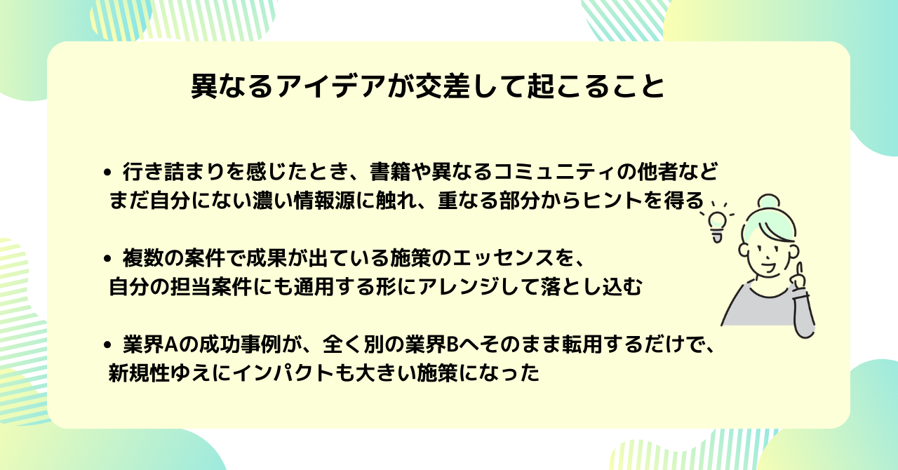 手元のアイデアが新鮮さにかけるなら、一見関係なさそうに見える分野からも学び、思い込みの垣根を壊して、新しく掛け合わせるのが近道になる場合があります。
