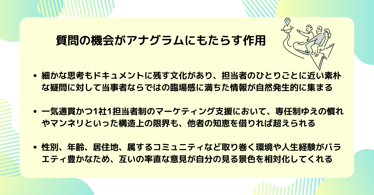 ビジネスモデルの構造上の限界を超えやすくなったり、多様なバックグラウンドの魅力を引き出したりと、質問がチームへもたらすポジティブな作用は1つではないのです。