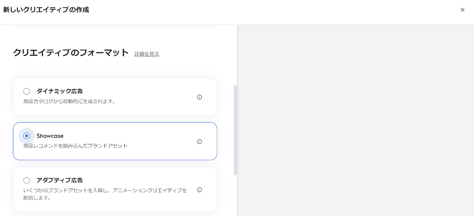 2.広告名を設定し、クリエイティブのフォーマットで「Showcase」を選択