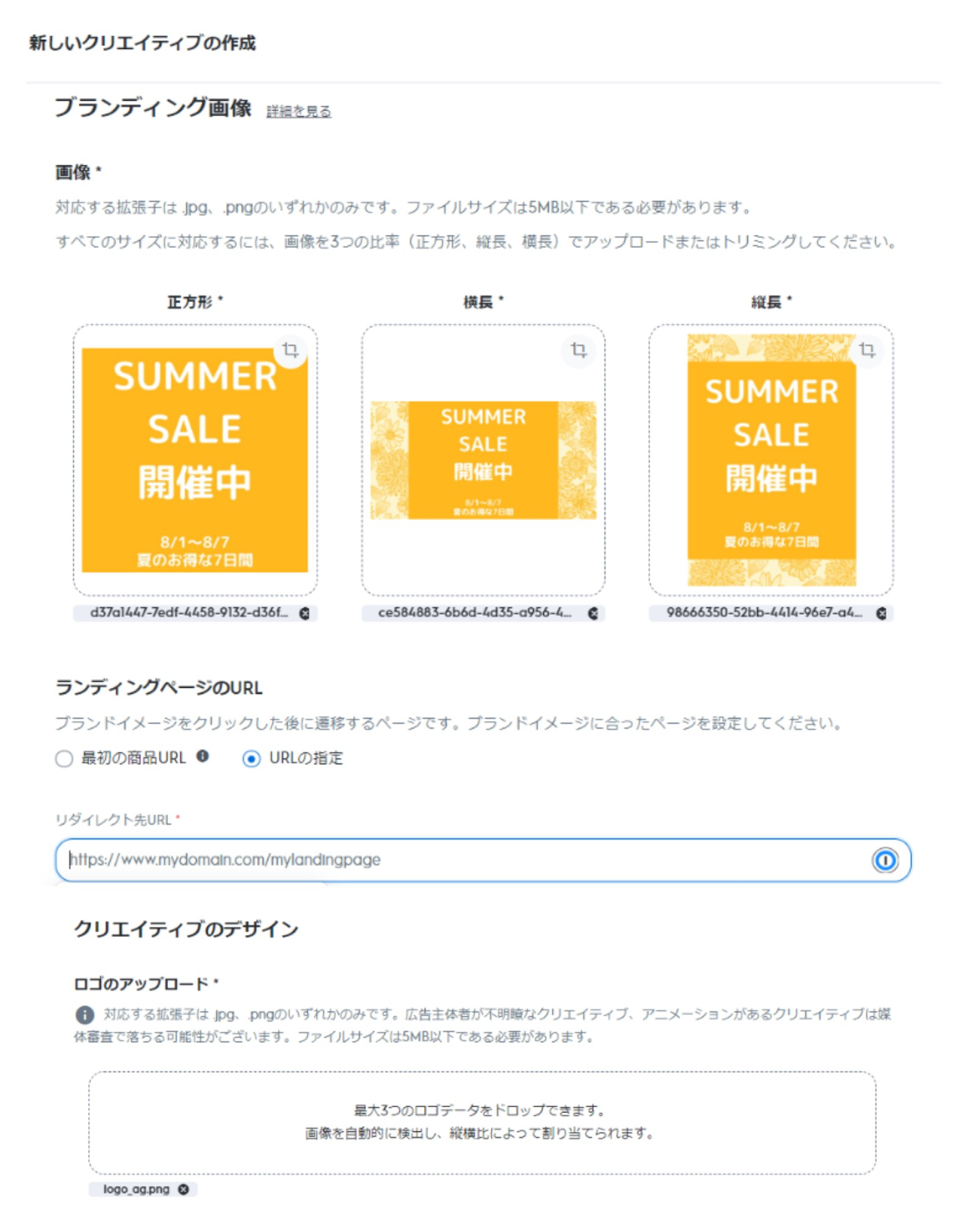 | ブランディングビデオ(動画) ※画像または動画どちらかが必須 | 広告で使用する動画 | ファイル形式:mp4 ファイルサイズ上限:25MB 解像度:720p以下 最長時間:30秒 推奨時間:15秒 アスペクト比 ・横型16:9 ・縦型9:16 ・正方形1:1 |