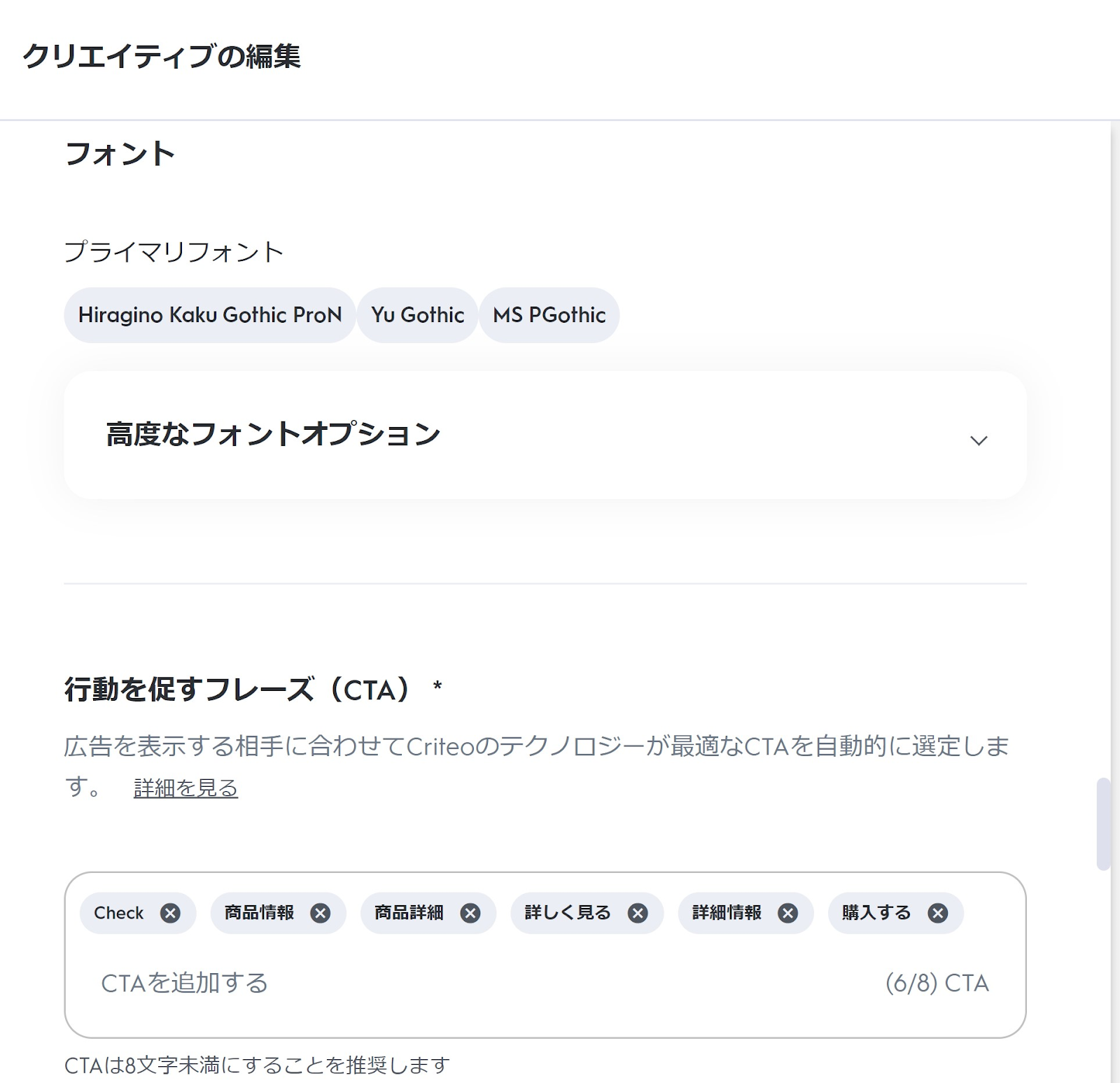| 行動を促すフレーズ(CTA) | CTAボタンのフレーズを設定 | 8文字未満が推奨 複数設定することも可能ですが、その場合はCriteo側で自動選出されます |
