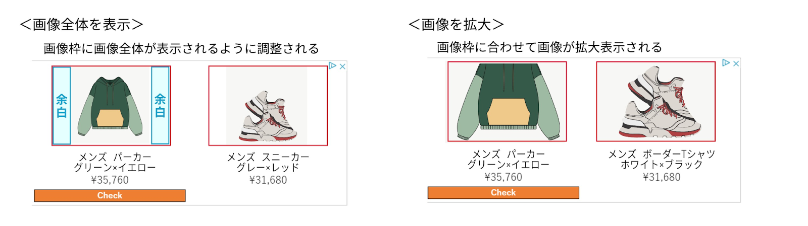 Criteoは多様な配信面を持っており、バナーサイズによってカタログアイテムエリアのアスペクト比も変動します。そのため「画像を拡大」を選択した場合、アイテム画像が見切れる可能性があるため注意が必要です。