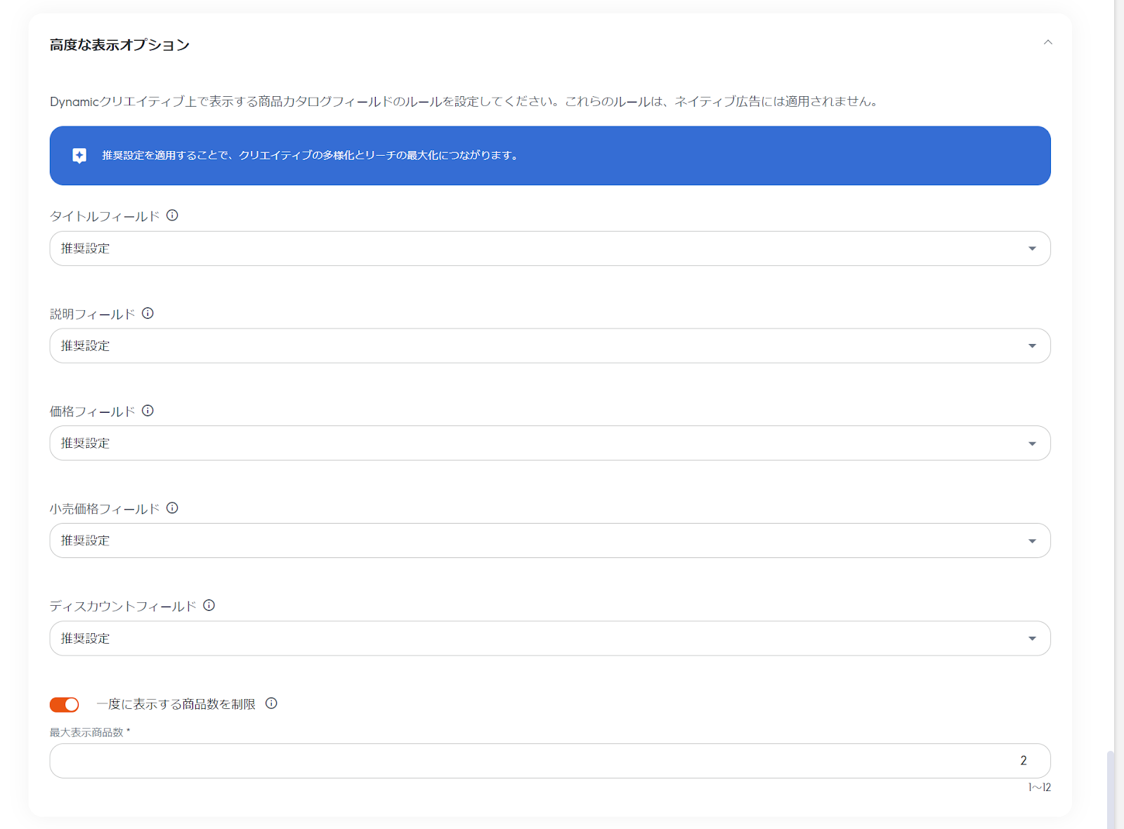 高度な表示オプションでは、タイトルや価格などカタログアイテム枠で使用されるカタログ項目の表示ルールを設定できます。項目ごとに推奨設定、必須表示、非表示のいずれかの選択が可能です。