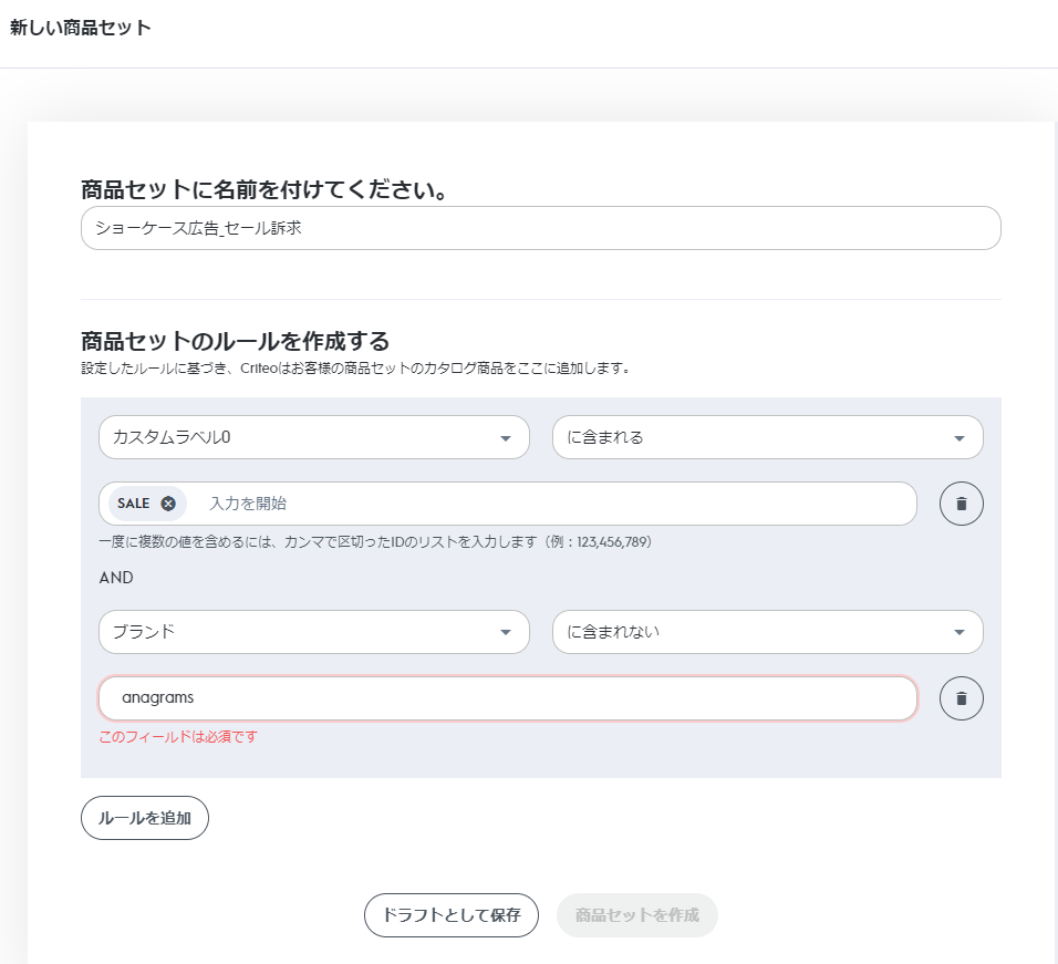 商品セット設定のルール作成画面から、フィード項目のブランド、カテゴリー、カスタムラベル、商品ID、価格の項目の条件をそれぞれ設定が可能です。配信するアイテムを絞り込んだり、配信するアイテムの露出のコントロールを行いたい場合は、カスタムラベルやブランド名からフィルタリングを行い商品セットを作成していきます。