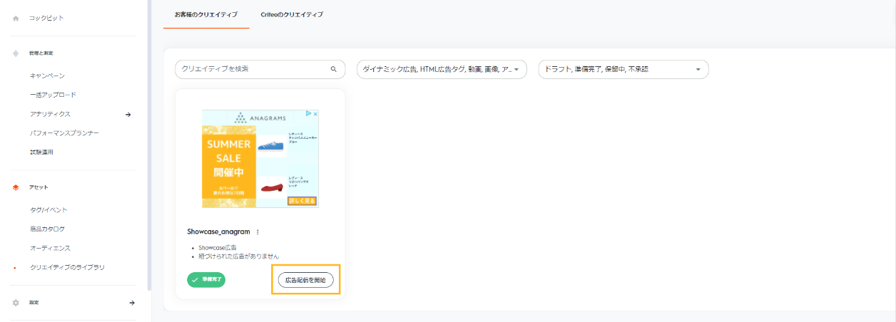 9.「クリエイティブのライブラリ」で保存したショーケース広告の「広告配信を開始」を選択