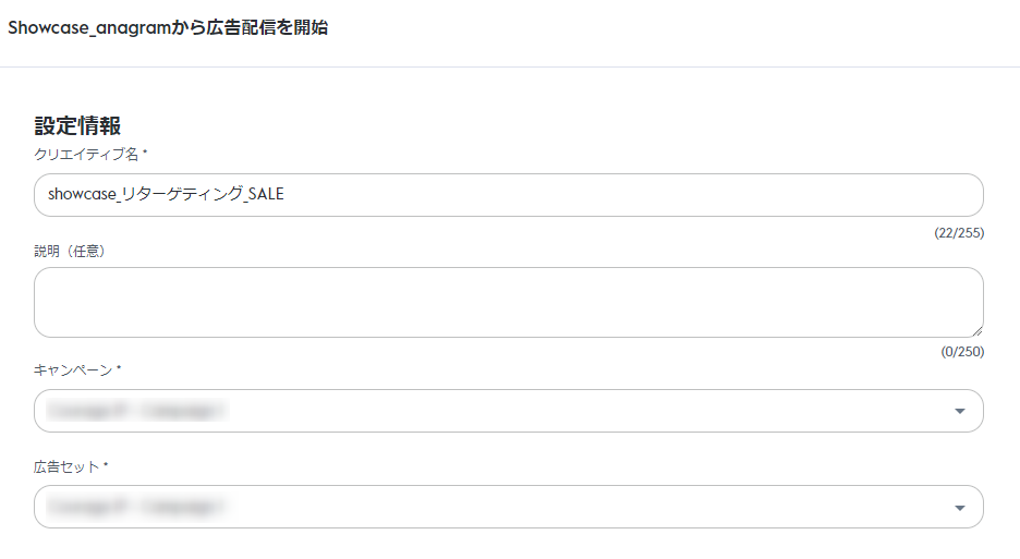 上記4つの素材が揃ったら、広告管理画面からショーケース広告の配信準備をしていきます。