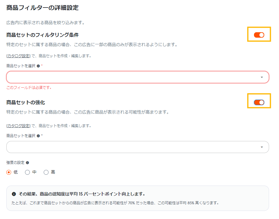 強度設定は「低」「中」「高」の3段階から選択が可能で、それぞれ「15%」「35%」「50%」と広告が表示される可能性を調整できます。設定する強度が高いほど、選択した商品セットの商品が広告に表示される可能性が高くなります。つまり、強度を高くすればするほど、商品との関連性が薄いユーザーへも配信が増えることと同義になるため、目的に応じて強度設定は調整しましょう。
