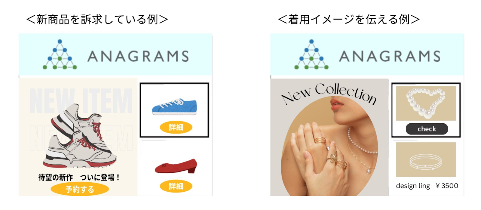 例えばアパレルECの場合、商品画像のみのカタログアイテムだけではサイズや着用時のイメージが伝わりにくい場合もありますよね。ショーケース広告ではカタログアイテムと一緒に常にバナーを表示できます。そのため、カタログアイテムだけではなく、バナーでアイテムの着用イメージや送料無料など購入の後押しとなる訴求をユーザーに伝えられる場合は、ショーケース広告の活用をおすすめします。