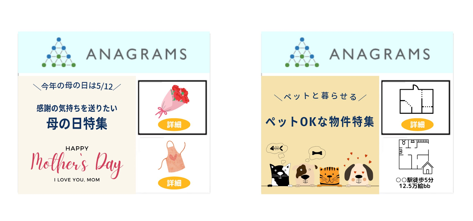 例えば、「母の日特集」というバナーを使用し、母の日のプレゼントアイテムのみに表示アイテムを絞ったり、「ペット可物件」というバナーを使用し該当物件をカタログアイテムとして表示するなどの活用方法も考えられます。