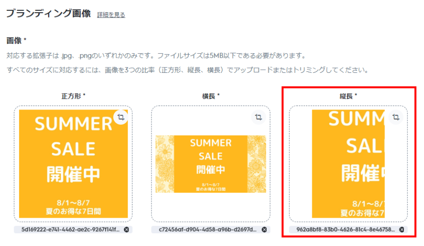 | ブランディングバナー(画像) ※画像または動画どちらかが必須 | 広告で使用するバナー画像 | ファイル形式:.jpgと.pngのみ対応 ファイルサイズ上限:1MB アスペクト比:1:1 / 2:3 / 1.91:1 推奨の画像サイズ ・1200x1200px ・800x1200px ・1200x628px |