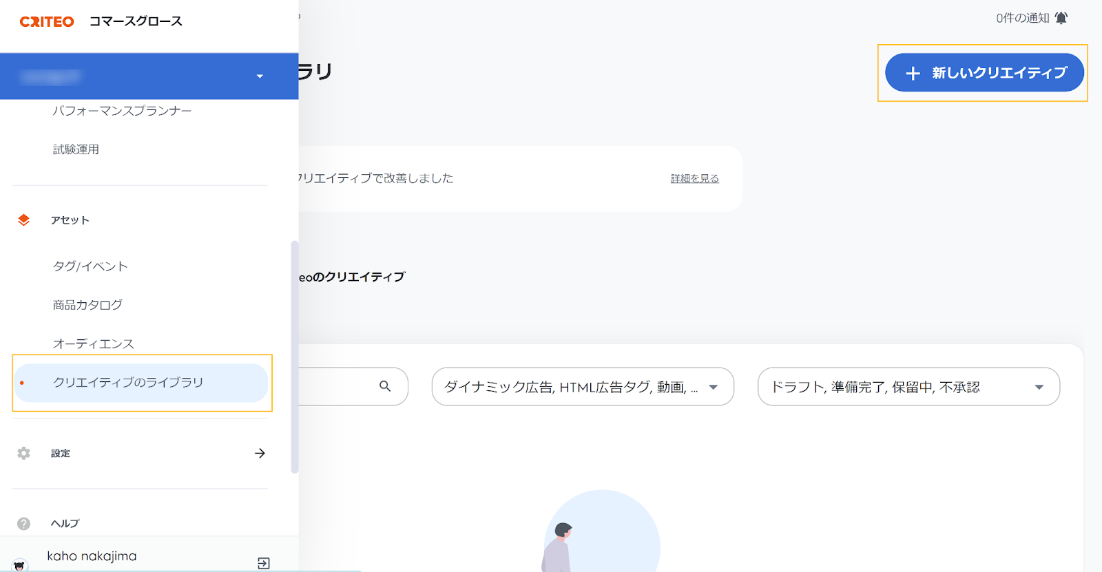 1.Criteo 広告管理画面右側の「クリエイティブライブラリ」を選択し「新しいクリエイティブ」をクリック
