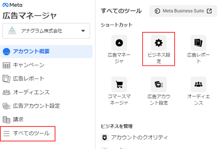 ①ビジネスマネージャ左上のハンバーガーメニューから「ビジネス設定」を選択