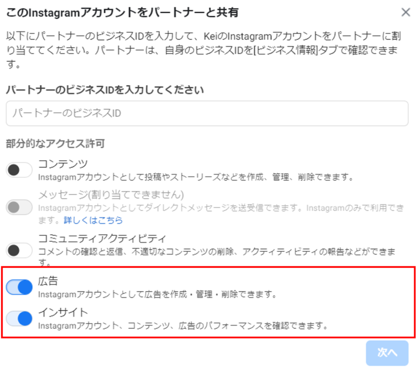 ③「広告」「インサイト」のアクセス権がオンになっているか確認しましょう