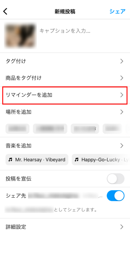⑤投稿の作成を完了し、[シェア]をクリックしてリマインダー付きの投稿は完了です!