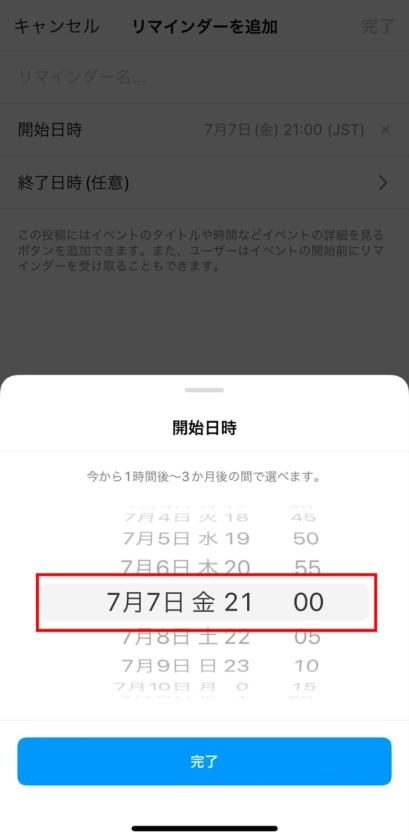 リマインダー付きの投稿はイベント開始の3ヶ月前から1時間前の間に作成する必要があります。