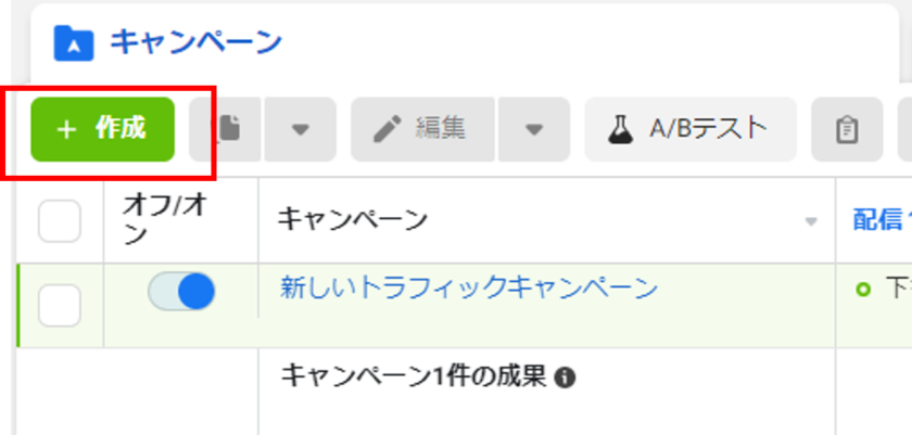 1.広告マネージャを開き、[作成]からキャンペーンを作成します。