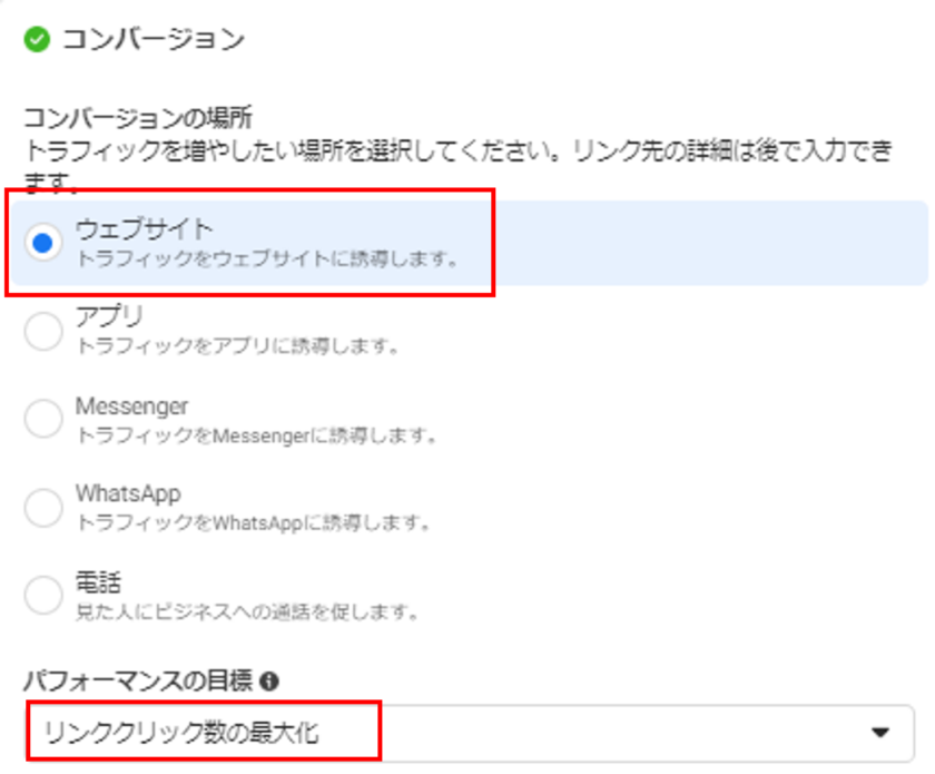 リマインダー投稿を広告として配信する場合、キャンペーン目的はトラフィックを選択し、コンバージョンはウェブサイトを選択する必要があります。