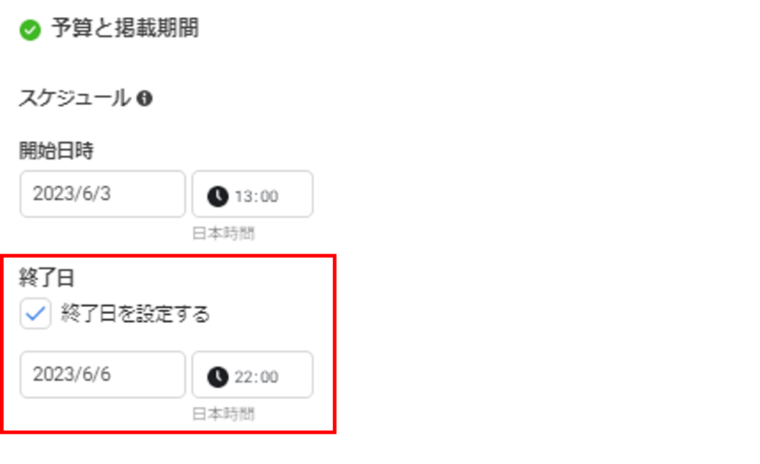 Meta社へ確認したところ、広告配信の終了日はイベント開始の1時間前までにする必要があるとのことです。2023年7月時点では、終了日をイベント前1時間以内での設定は可能ですが、実際の広告配信はイベント開始1時間前で配信は停止される仕様とのことです。