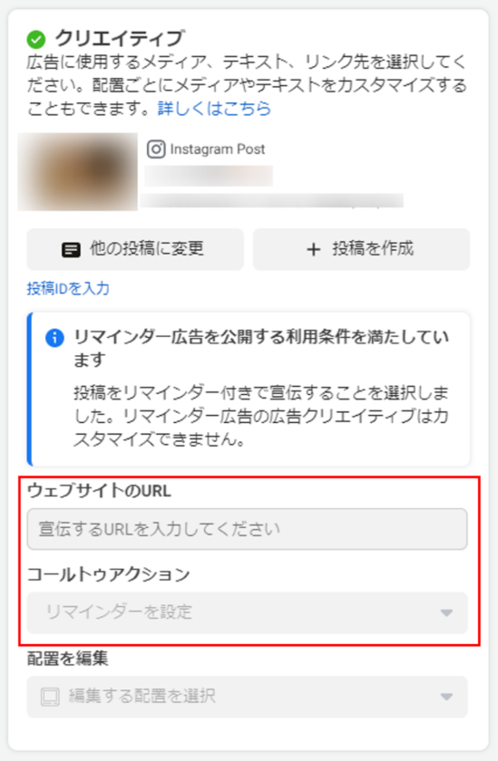 リマインダー広告はInstagranのみへの配信となりますが、仕様上「Advantage+ 配置」を選択する必要があるため注意しましょう。