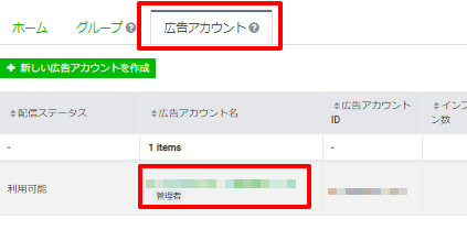「広告アカウント」タブから、画像クリックオーディエンスを作成したい広告アカウント名をクリックします。