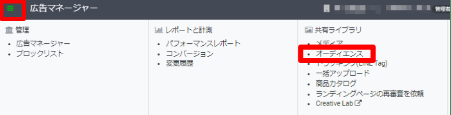 広告マネージャー画面左上のメニュー「≡」をクリックして「共通ライブラリ」の「オーディエンス」をクリックでオーディエンス一覧ページを開きます。