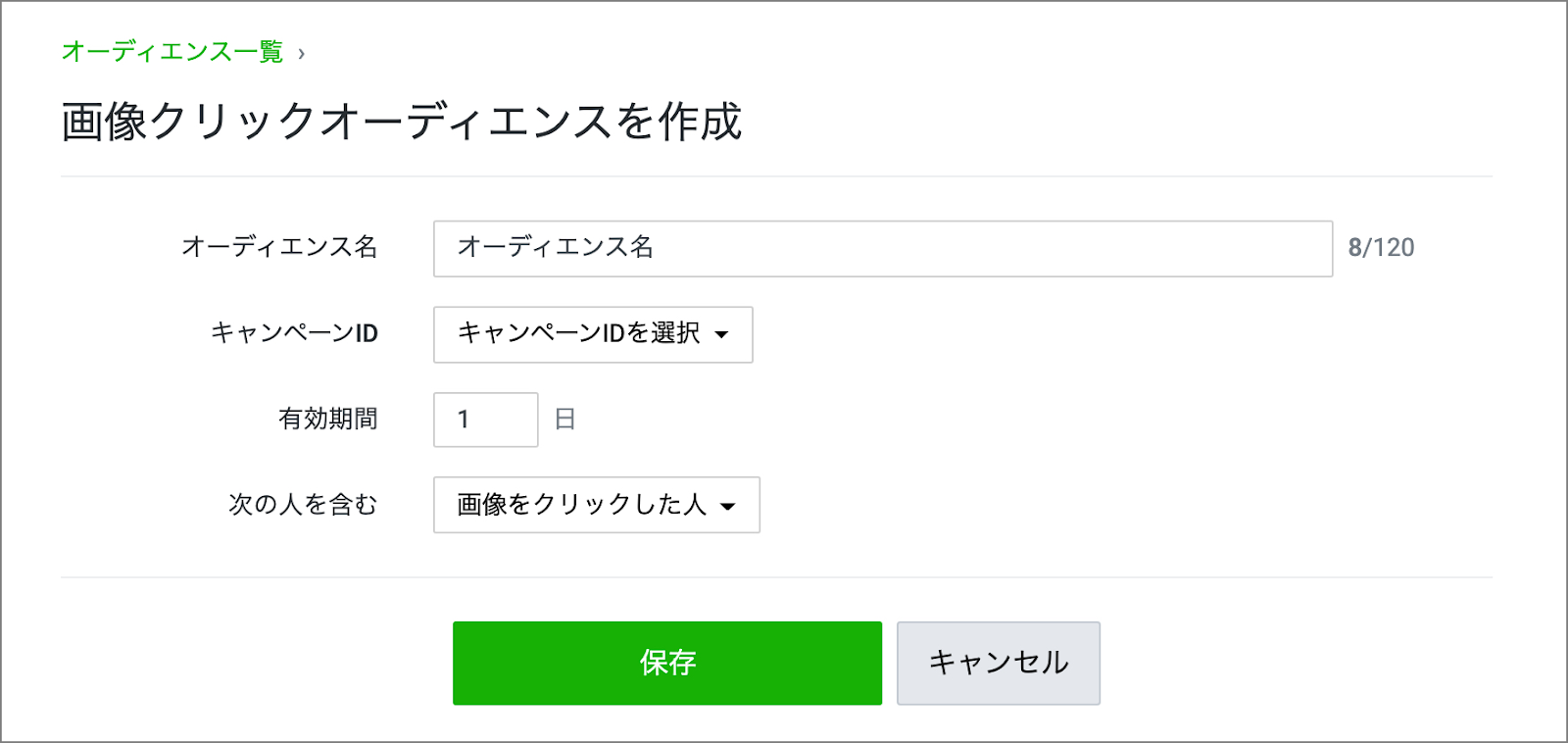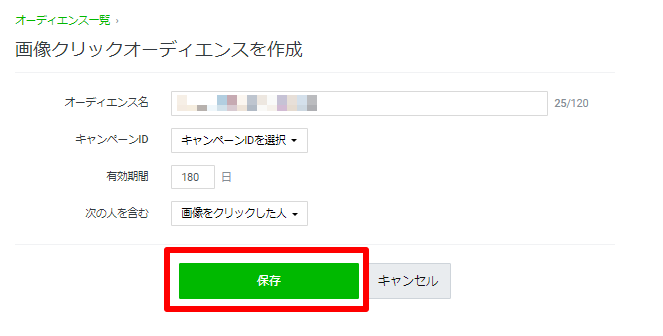 項目を入力して「保存」をクリックで画像クリックオーディエンス作成完了です。