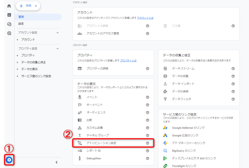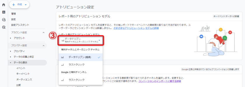 データ表示内の ②「アトリビューション設定」をクリックします。