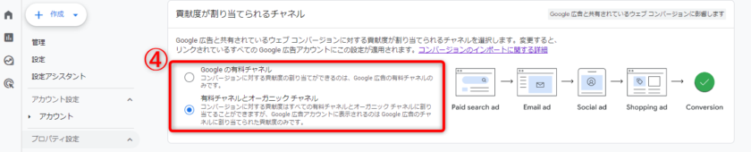 ④GA4とGoogle広告のアカウント連携が完了している場合、Google広告と共有しているGA4で設定したキーイベント(コンバージョン)の貢献度を割り当てられるチャネルが選択できます。