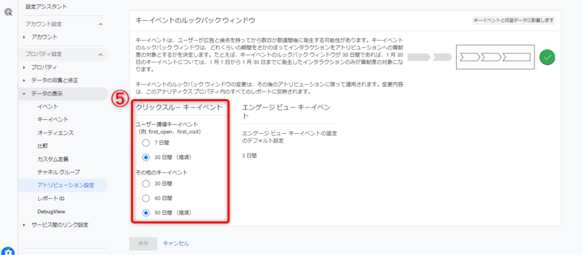 ⑤「クリックスルーキーイベント」の期間を設定します。ここは、コンバージョン発生日から何日前のクリックまで遡ってアトリビューションへの貢献の対象とするかを設定する箇所です。