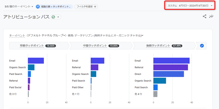 上段では、「早期」「中間」「後期」の3つのタッチポイントごとに、コンバージョンへの貢献度を把握できます。